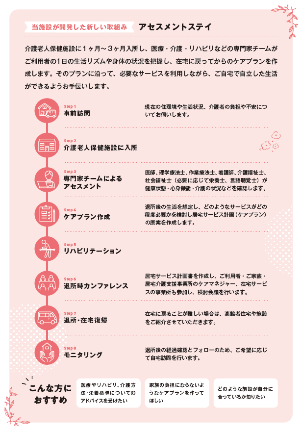 また、今後の生活を想定し、様々な視点から 多職種が関わる『アセスメントステイ』を 利用することもできます。