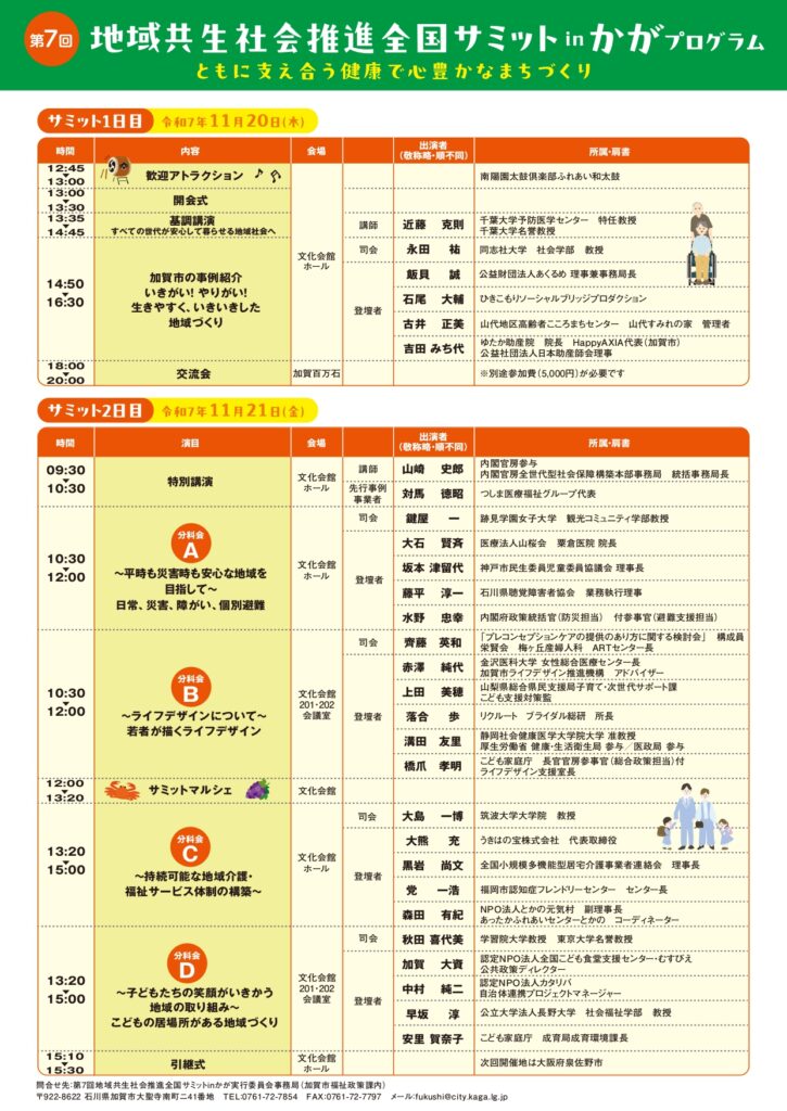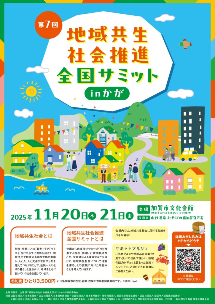 11月20日(木)~21日(金) 「第7回地域共生社会推進全国サミット」が石川県加賀市で開催されていますが、このサミットに つしま医療福祉グループの対馬代表、日本医療大学の山崎史郎客員教授、同じく大島一博客員教授が特別講演・分科会コーディネーターとして出演しています。